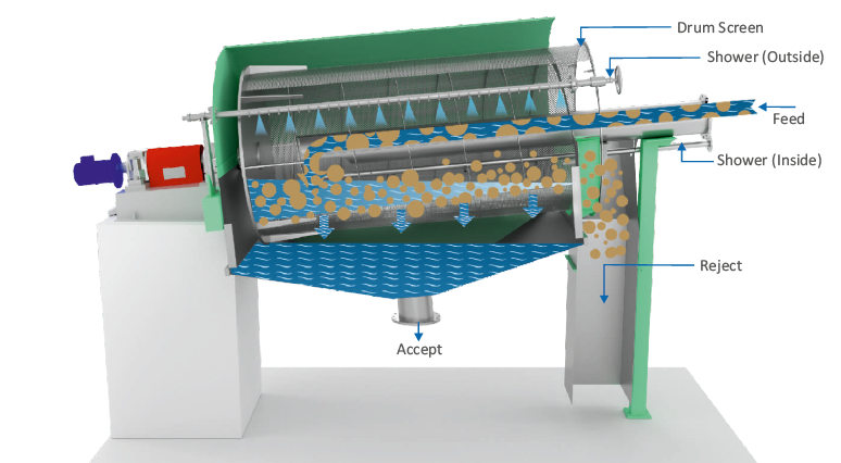 Trommels are cylindrical screens that rotate to separate materials based on size. In the detrashing system, both inclined and horizontal trommels are used to screen out impurities. Inclined trommels rely on gravity to assist in the separation process, while horizontal trommels use rotation to achieve the removal of heavy reject like tetra pack in the cyclic oprations. These machines efficiently remove larger contaminants from the raw material.